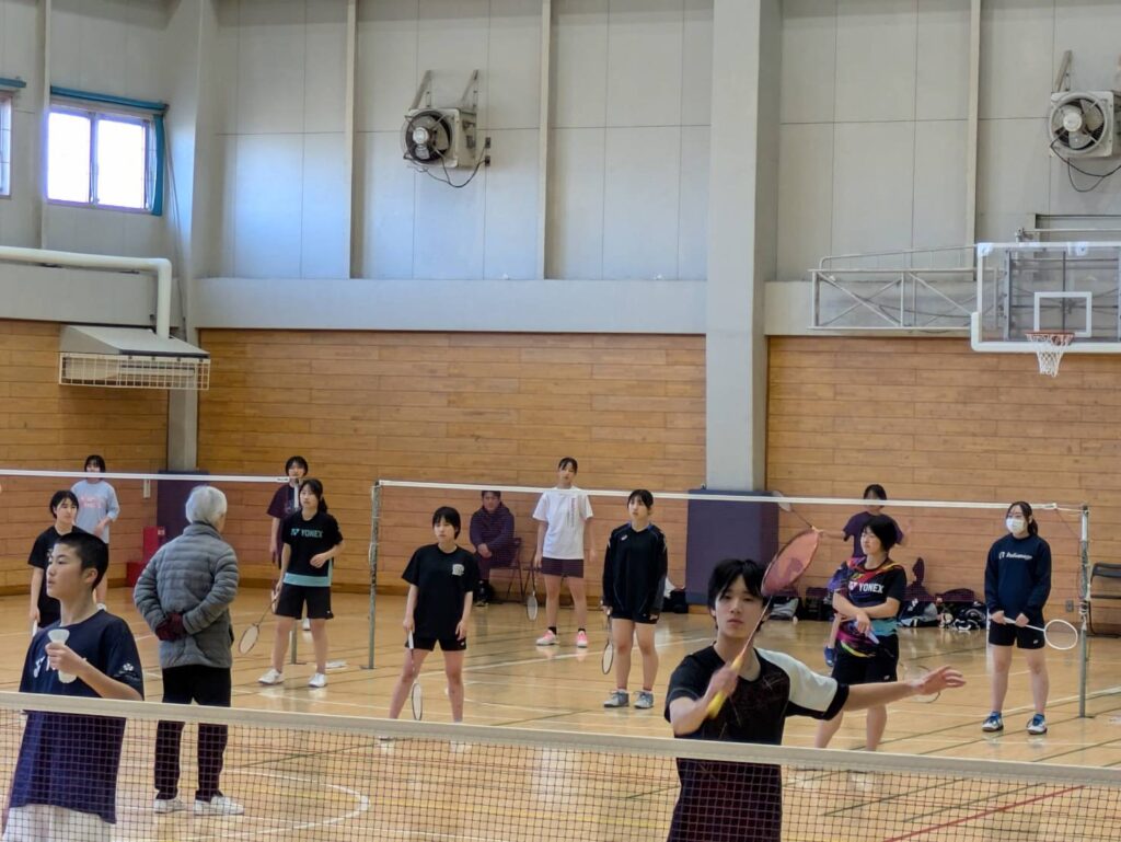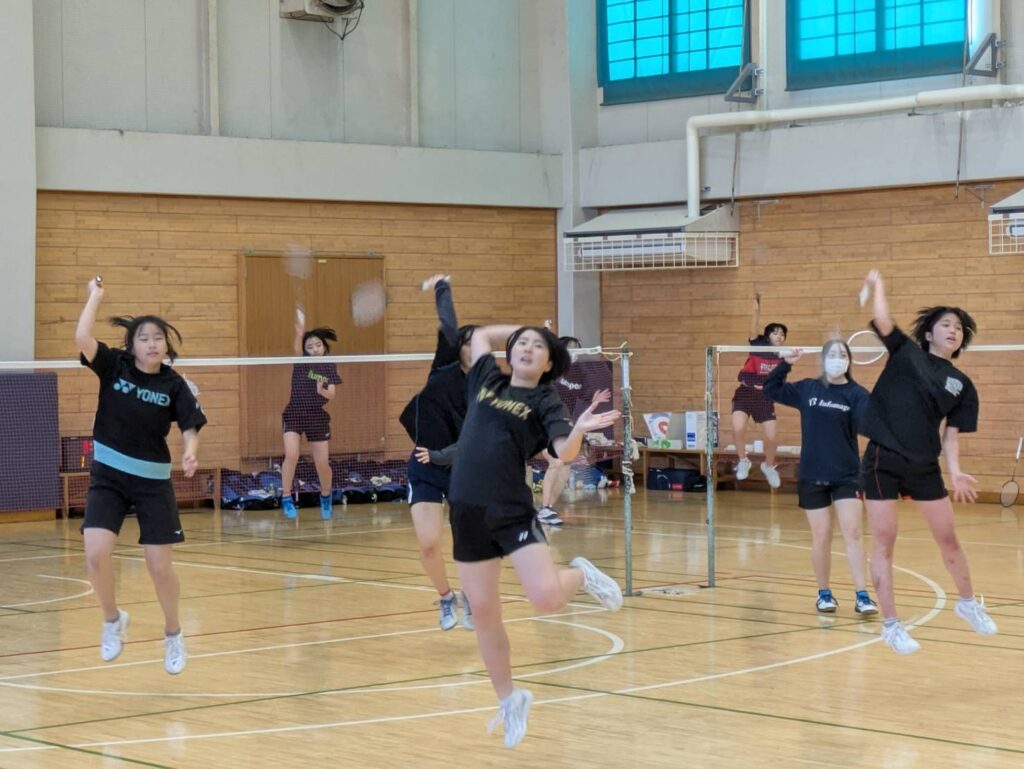 女子は、同校の高瀬、有川の2人による、「動的ストレッチ&ステップワーク」から少しずつ動きながら、最後はシングルス、ダブルスとも対面での実践練習まで練習を進めました。